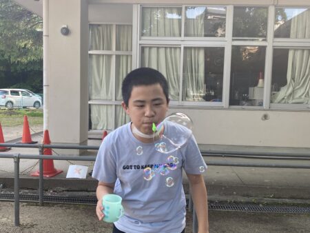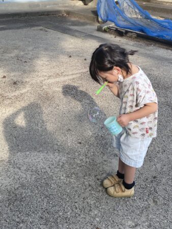 今回は風がなくしゃぼん玉を高く上までとばす事が難しかったですが、大きなしゃぼん玉を作り、みんなで誰が大きなしゃぼん玉を作れるかの競争したり、楽しむことが出来ました。