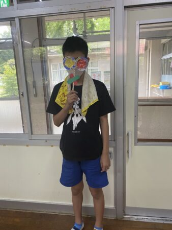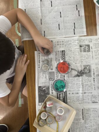 メガネのふちに絵を描いたら、好きな色のカラービニールを付けます。左右違う色にしている子もいました。