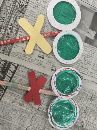 メガネを2つ作り、割り箸に付け、割り箸に羽を付けてトンボの形にすると完成です。