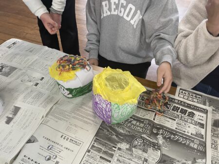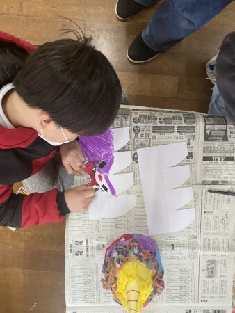 今回、2月3日の節分に向けて二週にわたって鬼の帽子制作を行いました。
